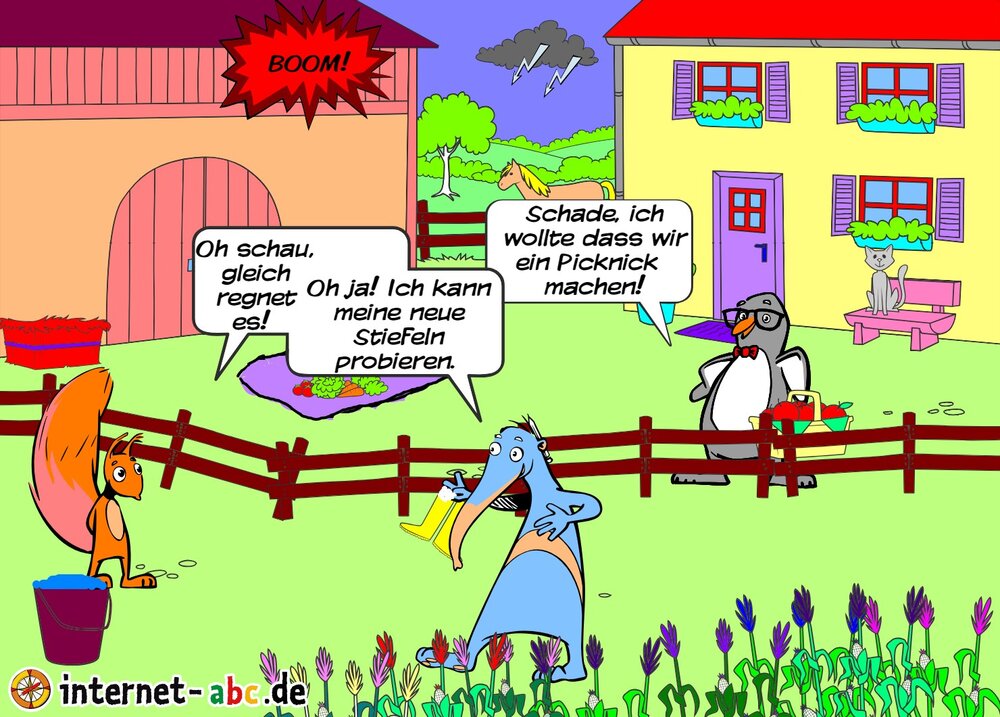 Aber dann, Flizzy hat ein Idee: Sie können zusammen im Regen spielen. >Gute Idee!< meint Percy.