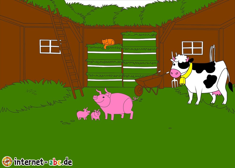 Die große Kuh im stall und das kleine Schwein auf der Wiese