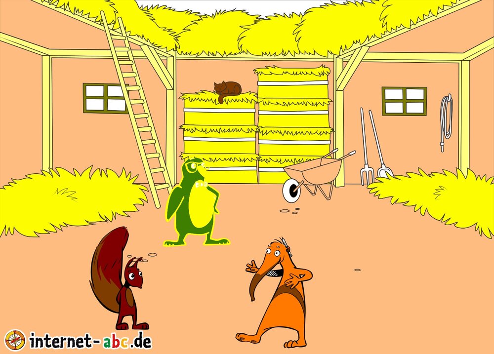 die Freunde treffen sich auf dem Bauernhof. Sie wollen uns Bauer Alfred ein bisschen auf dem Hof helfen, indem sie den Stall ausmisten