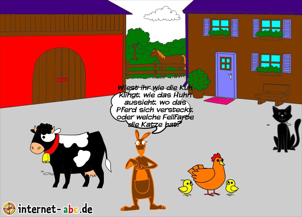 Manno Mann wie cool das hier aussieht. Dieses Huhn und seine küken da drüben eine Kuh hier hinter mir ein Pferd und da sitzt eine Katze.