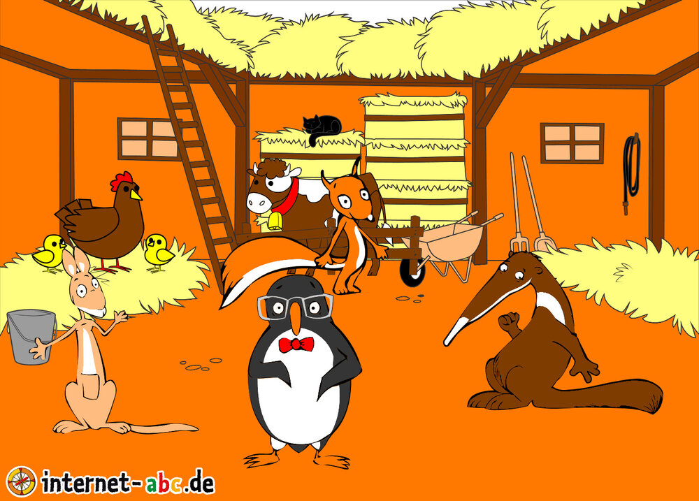Die Freunde treffen sich im Stall und sehen sich die Tiere an.