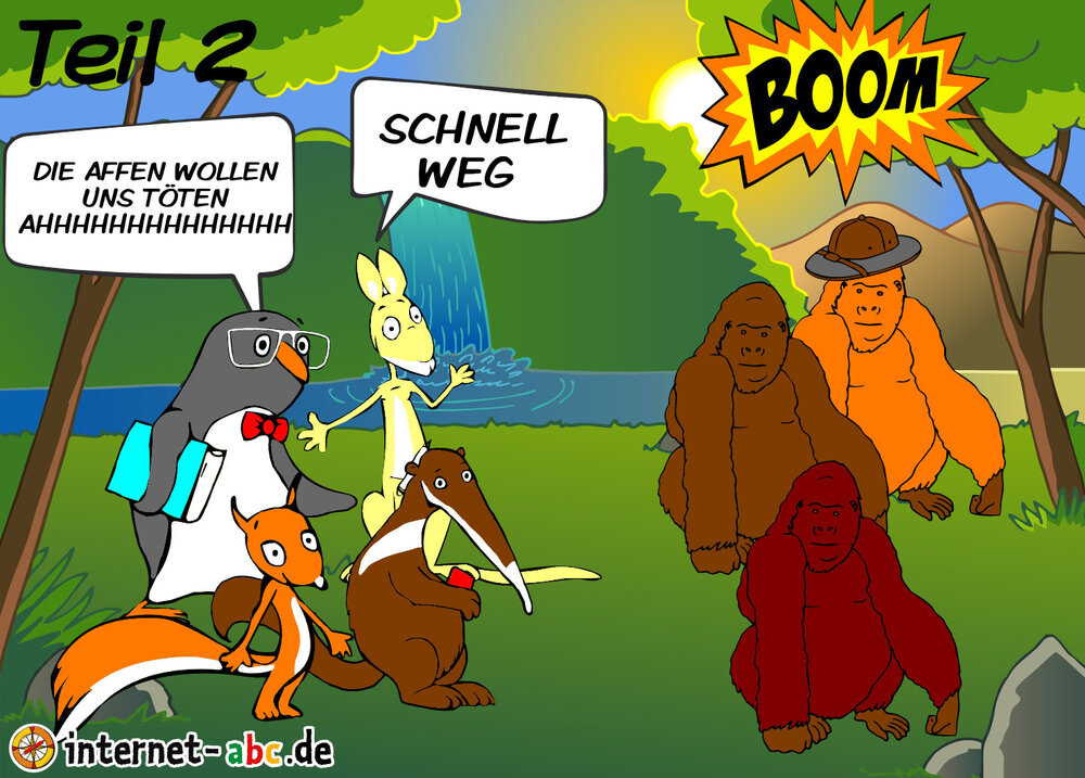 ALS DIE FREUNDE WEITER GINGEN SPRANGEN DIE GRO?EN AFFEN AUS DEN BÜSCHEN HERAUS. EDDIE WUSSTE SOFORT WER SIE TÖTEN WOLLTE UND DAS WAREN DIE GRO?EN DICKEN AFFEN ABER AUF EINMAHL FANG EIN DICKER AFFE AN ZU BRÜLLEN DIE ANDEREN DICKEN AFFEN WAREN AUF DEN BRÜLLENDEN DICKEN AFFEN WÜTEND ALSO FANGEN SIE AN ZU STREITEN.DANN KONNTEN DIE FREUNDE SCHNELL WEG WEIL DIE DICKEN AFFEN STRITTEN.UND DANN KAMEN DIE FREUNDE GESUND NACHHAUSE UND DIE DICKEN AFFEN BLIEBEN IM DSCHUNGEL UND STRITTEN WEIL DER DICKE AFFE BRÜLLTE.