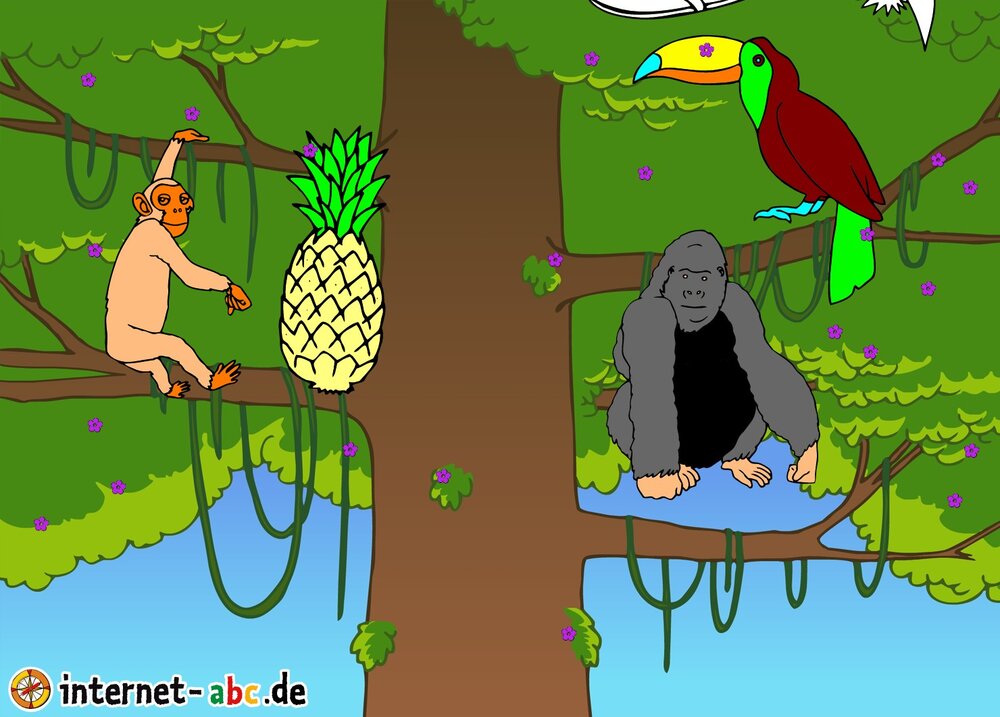 Die Vögel und Affen essen Opst unt haben vil Schpas .