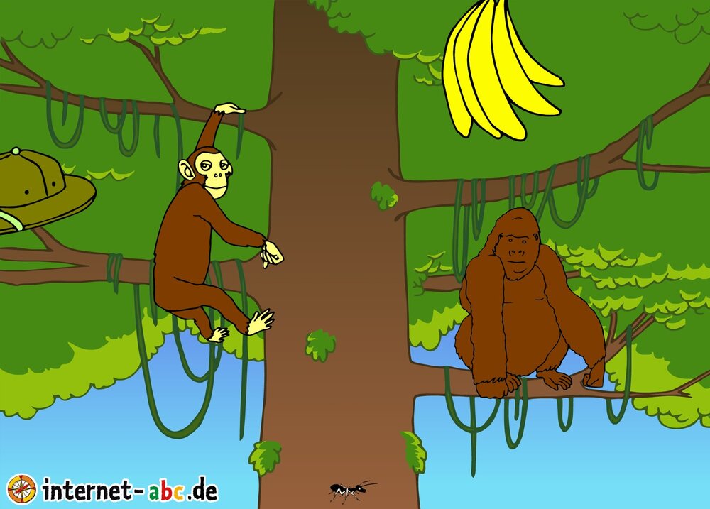 Ein affe und ein gurilla wundern sich.ein Hut hengt im Baum