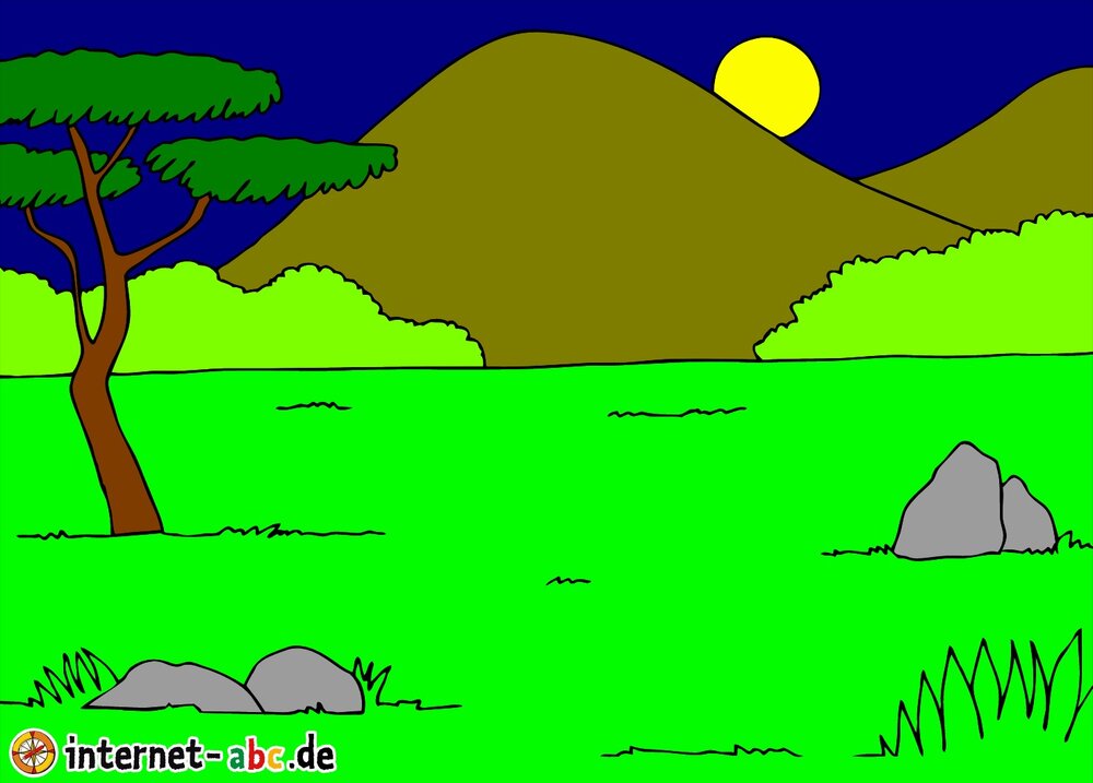Es war einmal eine einsame Wiese mit einem Baum,2Bergen und ein dunkler Himmel mit einem gelb leuchtnen Mond