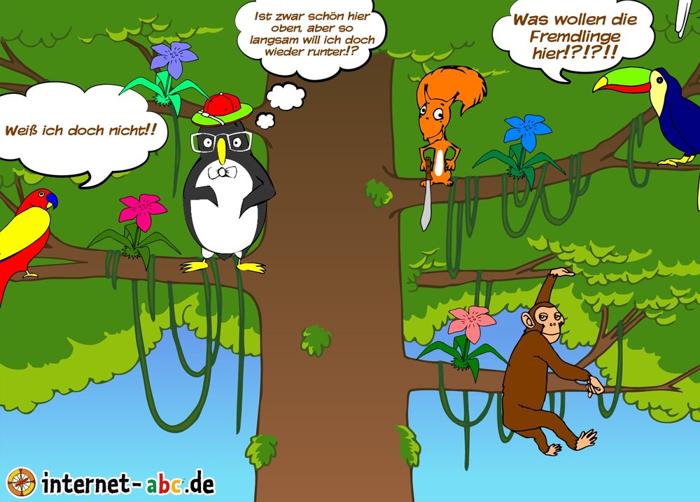 Der Pinguin und das Eichhörnchen haben einen Ausflug in den Regenwald gemacht. Dort treffen sie Papagei und Tukan, mit welchen sie sich anfreunden.