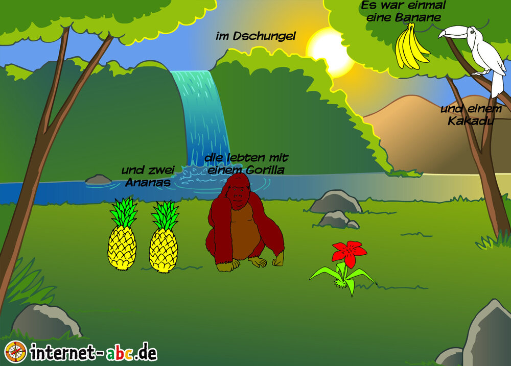 Es war einmal im dschungel da trafen sich zwei Ananas mit einer Banane sie giengen weiter und trafen den Gorilla mit seinem Freund den Kakadu