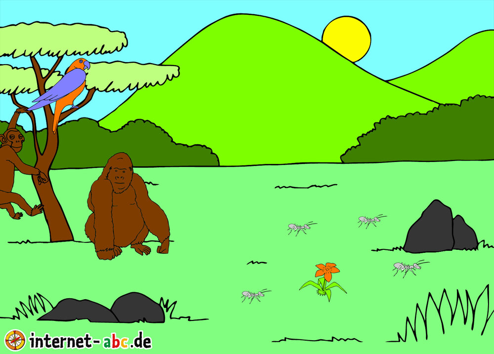 An einem Junglemoren kam ein Gorilla mit seinem Kind. Die Sonne schien und der Himmel war blau. Sie hatten viel Spaß zusammen.