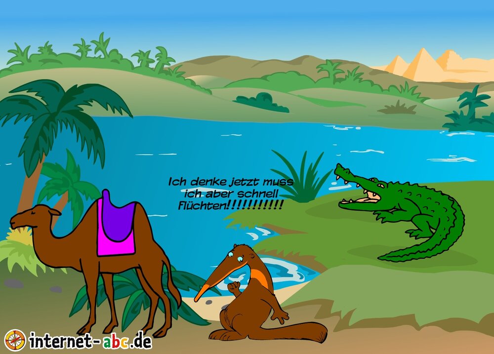 Percie ging nach Ägypthen ind traf da ein Kamel. Plötzlich erschrack Percie ab einem Krokodil.