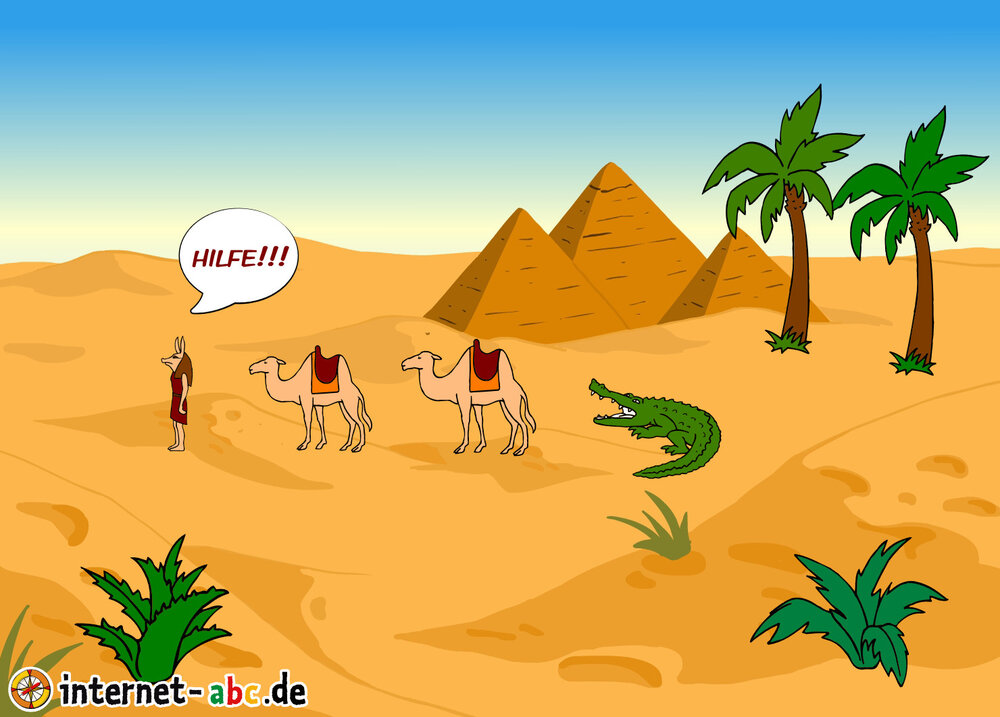 Die Ägypterin Enie hat ein Geschäft aufgemacht, sie verkauft Kamele und bringt sie zu den Besitzern. Heute bringt sie ihre zwei größten Kamele zu dem neuen Besitzer: Ruley. Sie muss durch die Wüste laufen, am Krokodil-teich vorbei und an den Bungalows vorbeilaufen. Doch heute war alles anders: Enie lief am Krokodil-teich vorbei und erschrack fürchterlich. Ein Krokodil brüllte gaaaaaaaaanz laut und lief auf Enie und die Kamele zu. Enie rannte mit den Kamelen im schlepptau richtung Bungalows, doch das Krokodil kam immer näher und näher. Schließlich rief Enie " Hilfe!!!" und eines der Kamele quiekte doch es sprang rechtzeitig zur Seite und das Krokodil landete mit einem Satz im tiefen Teich. Enie war erleichtert, das sie und ihre Kamele unverletzt bei Ruley ankamen. Viel Spaß beim lesen und anschauen.