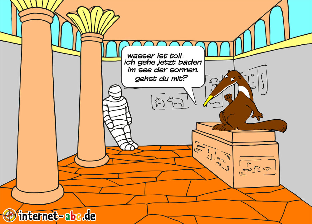 das tier fragt die mumie ob sie mitkommen will zum see der sonnen.