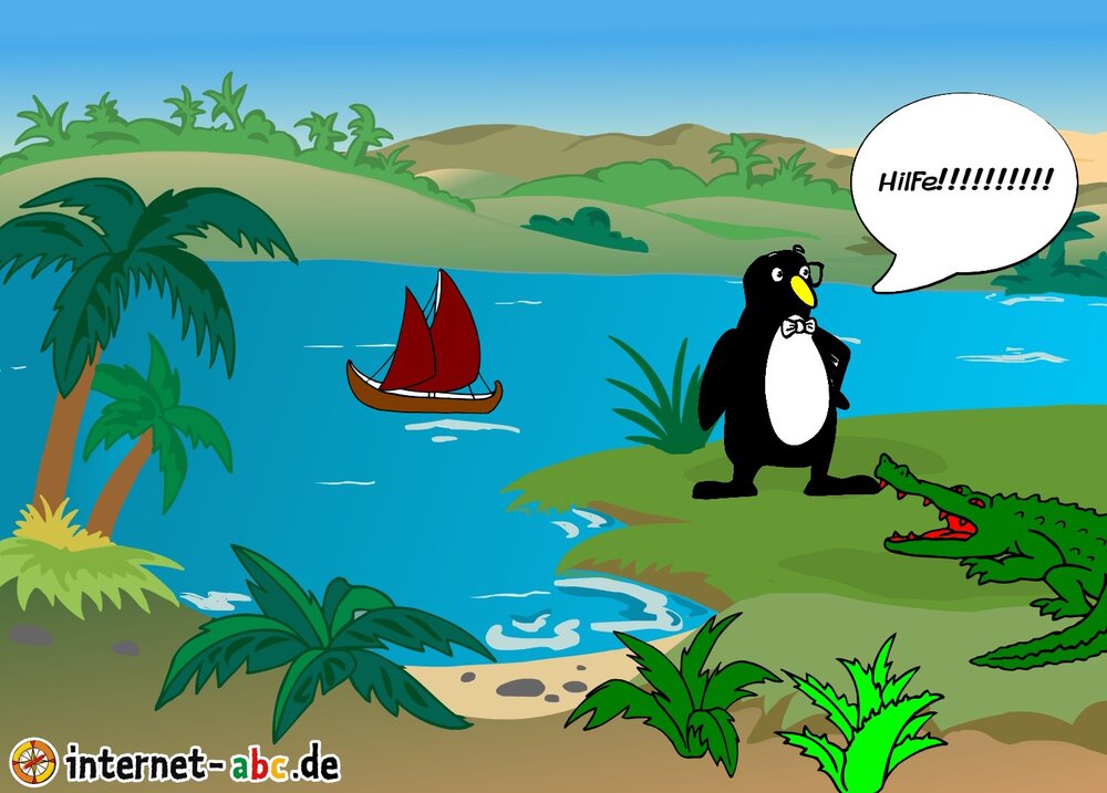 Der Pingoin war an einem alten Flussbett spaziren dann kam ein krokkodil und wolte ihn fressen.