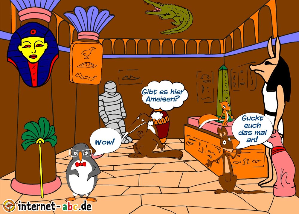 Eddie, Percy, Flizzy und Jumpy schauen sich das Grab des Pharao Tutanchamun an.