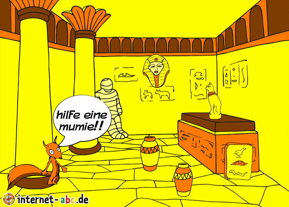 ein eichhörnchen geht in eine pyramide und siet eine mumuie.