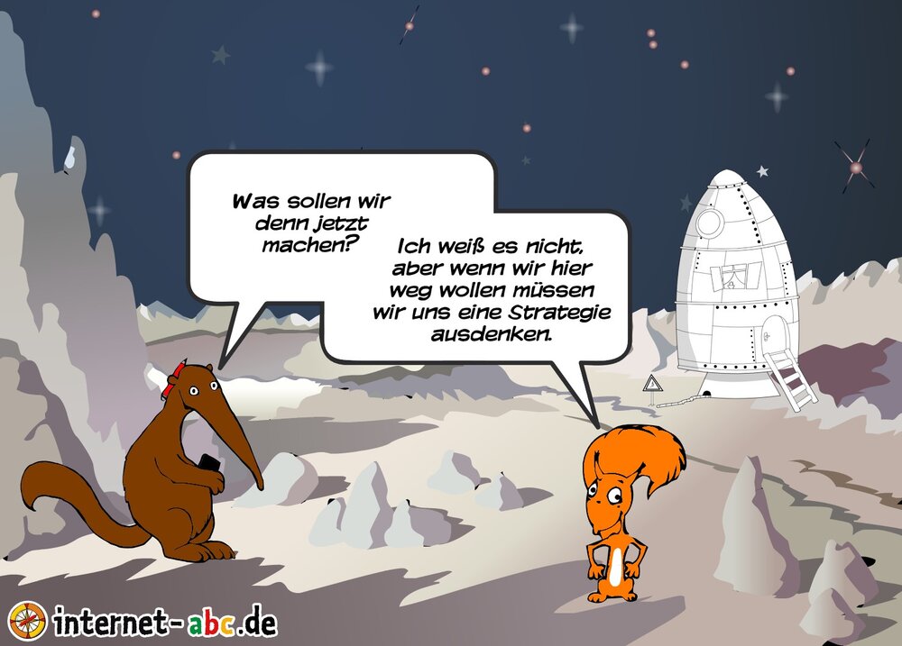Die beiden sind ratlos und wissen nicht was sie machen sollen. Ihre Rakete ist kaputt. Deshalb sitzen sie fest...