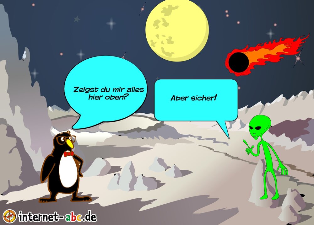 Der Pinguin ist endlich auf seinem Traumplaneten angekommen. Sein freund, der Alien zeigt ihm alles.