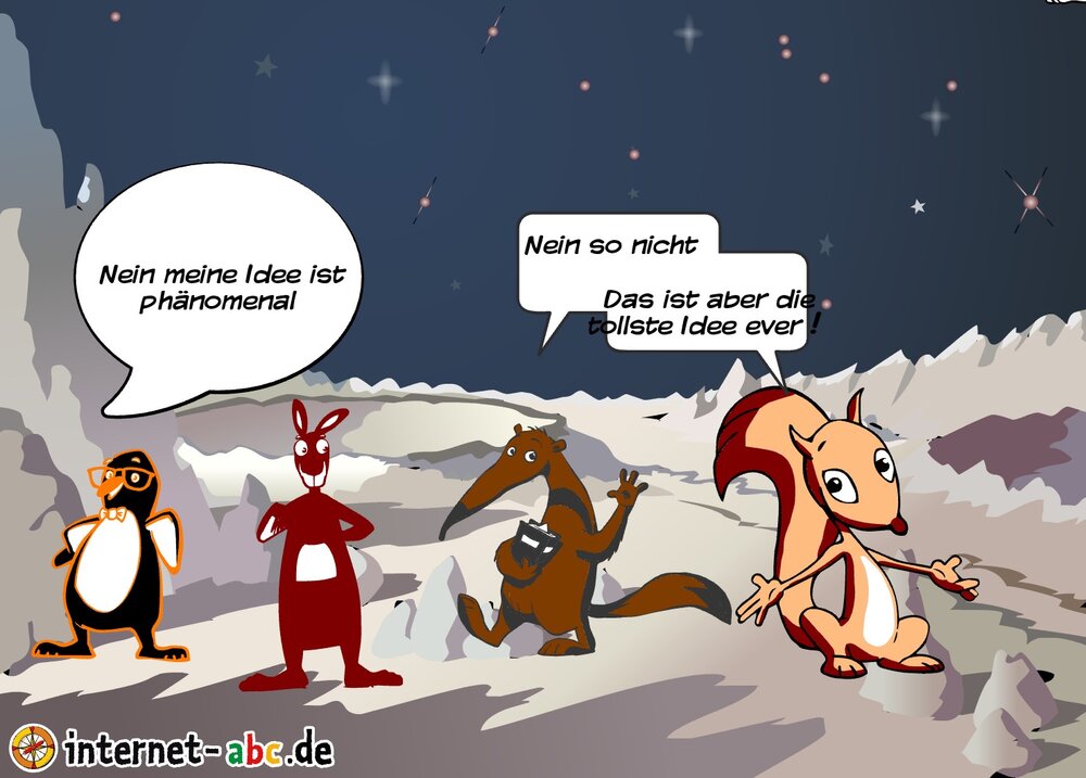 Das Internet abc macht Urlaub auf dem Mond alle diskutieren lautstark was sie machen wollen jumpy weiß schon er will ruhe
