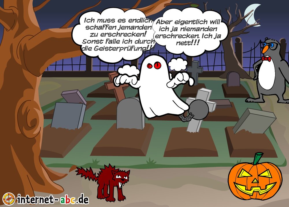 Der Geist will nicht durch die Geisterprüfung fallen aber er möchte auch niemanden erschrecken. Zum Glück kommt Ernie er durchschaut den Geist und erschrickt als der es versucht.