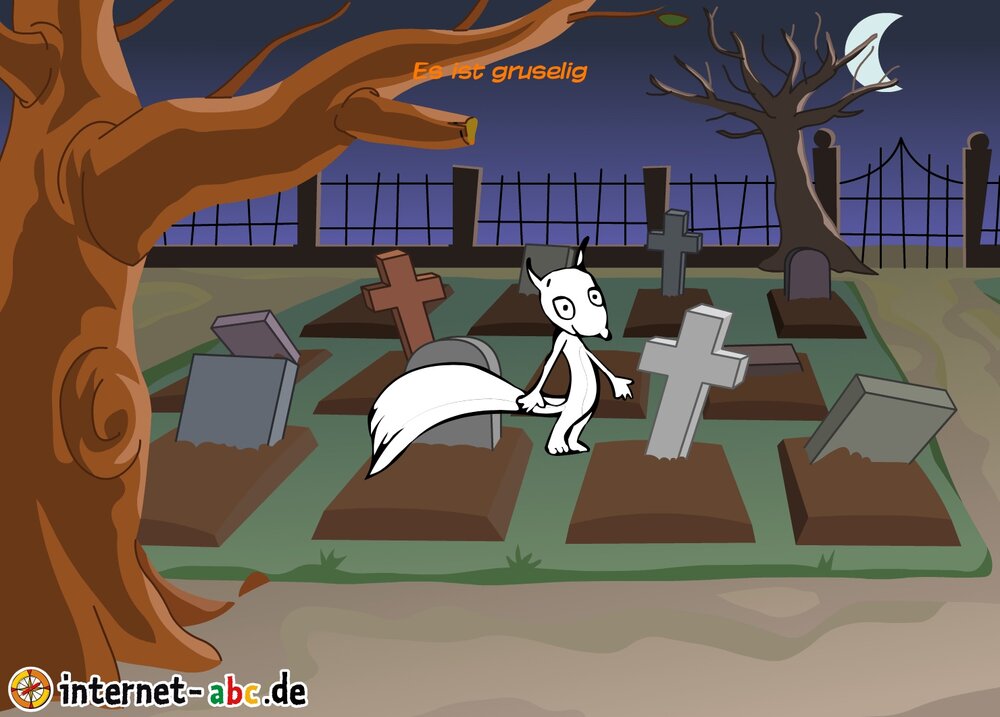 Einst auf einem gruseligen Friedhof, es war so finster. Es kamen Monster aus den Grabsteinen. Ich rannte und rannte, bis ich bei meiner Oma ankam.