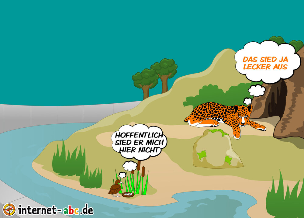 Die Ente hat sich verflogen, und ist im gehege vom Leopardt gelandet. Aber hoffentlich sied der Leopardt sie nicht und zum weg fliegen ist es nun auch zu spät. Dann würde der Leopardt sie sofoert sehen.