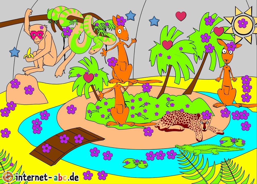 Die Kängurus spielen , die Krokodile schwimmen,und auch sind da : eine Affe und ein Leopard