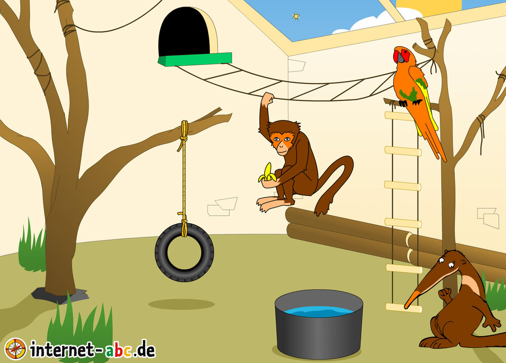 Heute ist es schön warm un alle sind wieder im Zoo, aber als sie im gehege des Papageis Bruno waren sahen sie einen affen und gingen hinein!