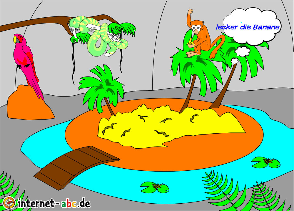 der Affe ist seine Banane schmeckt bestimmt gut.Die Schlange zichte und der Papagei sitzt auf seinen stein