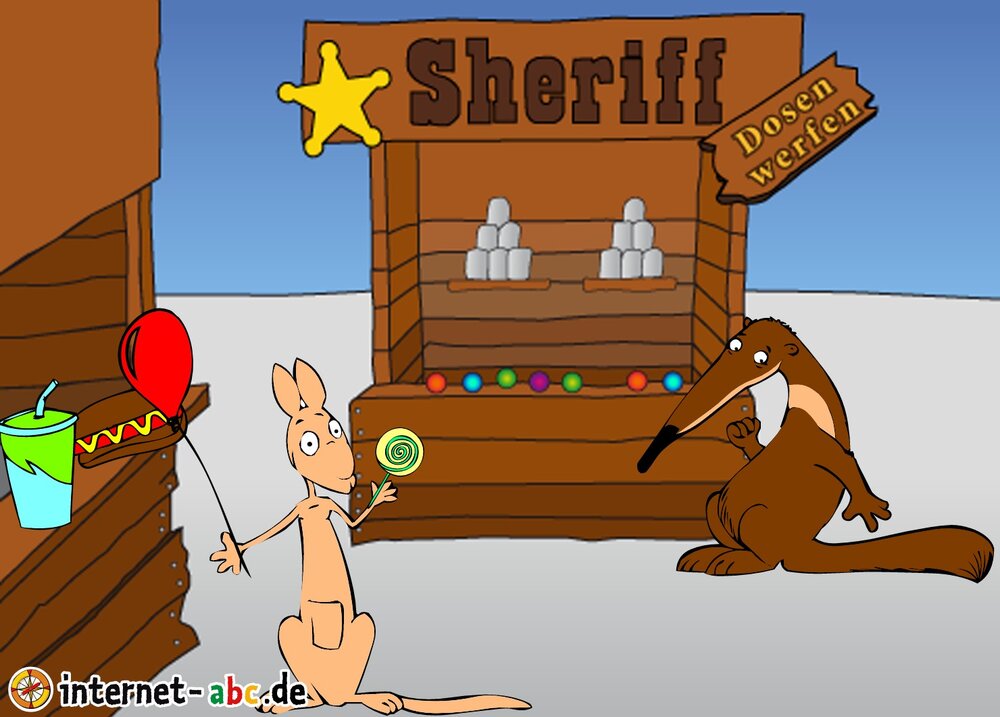 Percy und Jumpy sind beim Dosenwerfen . Jumpy hält einen Lutscher in der Hand und in der anderen einen Luftbalon.