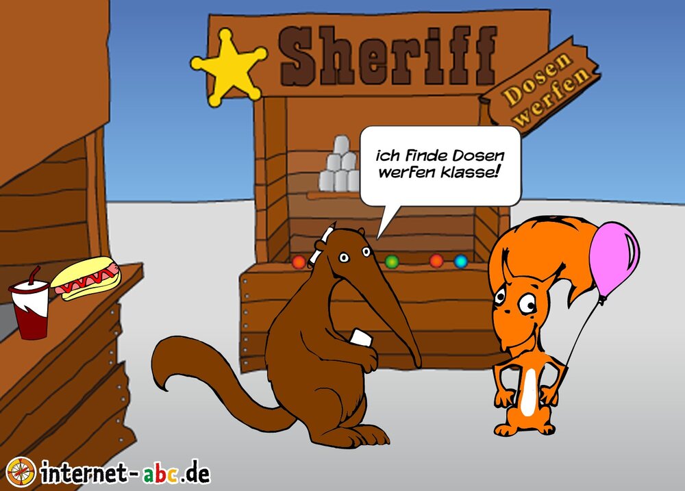 Zwei kleine Tierchen sind auf einem Festival und sind beim Dosen werfen stand.