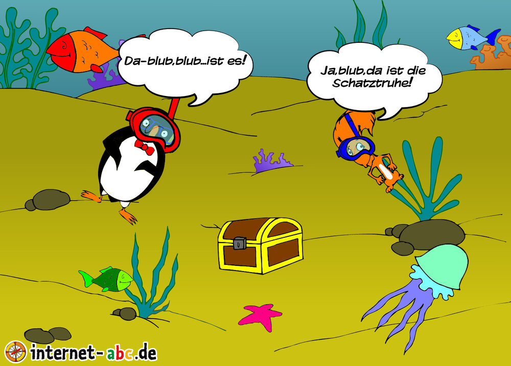 Flizzy und Eddi suchen unter Wasser eine Schatztruhe.
