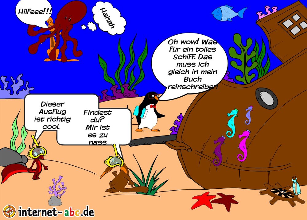 Die 4c ist auf einem Ausflug unter Wasser. Der eine Junge findet es ganz cool viel zu sehen, aber der andere findet es gar nicht toll, weil es zu Nass ist. Der Lehrer ist ganz fasziniert und schreibt alles auf. Das Känguru wird von einer Qualle angegriffen. Man sieht auch die tolle Unterwasserwelt.