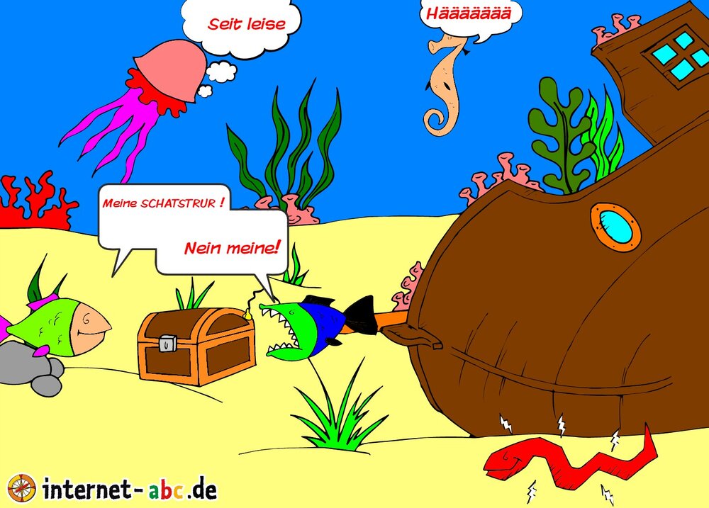 Zwei Fsche streiten sich um eine Schatztruhe. Die anderin sind wütend weil sie zu laut sind.