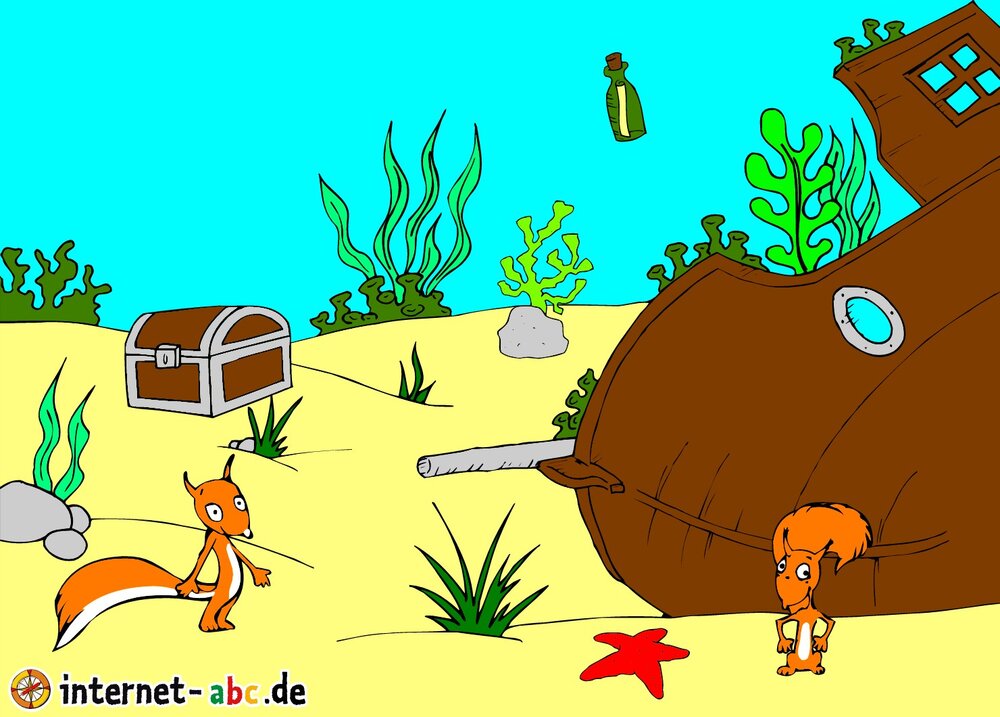 Flizzy war langweilig, doch plötzlich hörte er hinter sich ein leises Trippeln. Er drehte sich um - hinter ihm stand noch ein Flizzy. Dieser schlug ihm vor an den Strand zu gehen und im Meer zu tauchen. Gesagt - getan. Als sie untertauchen sahen sie ein großes Schiffswrack, das mit Seepflanzen zugewuchert war. Sie gingen an es zu besichtigen - und schließlich war aus einem langweiligen Tag ein spannender geworden.