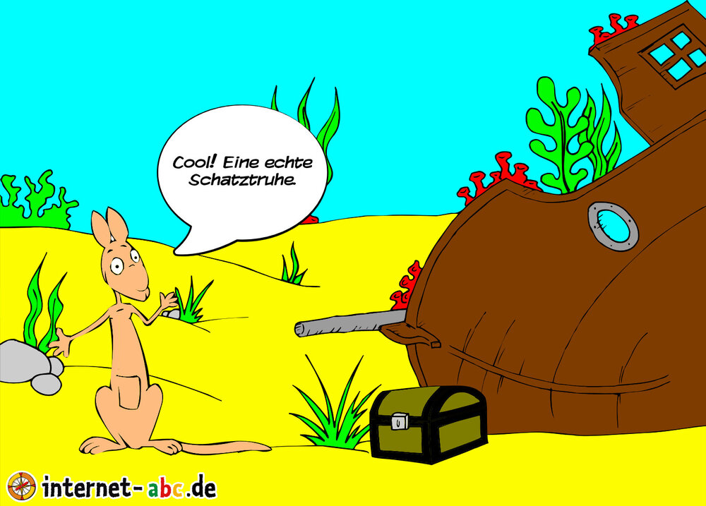 Jumpy enteckt unter Wasser eine Schatztruhe. Als er sie öffnet glänzen ihn Gold und Edelsteine an. Er hat einen echten Piratenschatz gefunden!