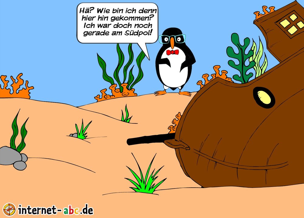 Der Pinguin wundert sich wieso er nicht am Südpol ist.