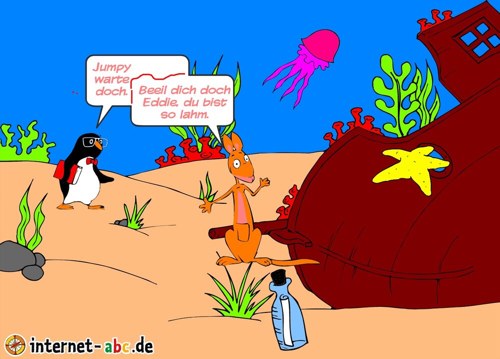 Meine Geschichte spielt unterm Wasser mit Jumpy und Eddie. Die beiden waren tauchen gegangen als sie ein Schiffswrack sahen und neben dem Wrack eine Flasche . Jumpy schwamm schnell hin ,Eddie rief Jumpy hinterher das sie doch warten solle. Doch Jumpy wartete nicht sondern rief :,, Beeil dich doch Eddie du bist echt langsam". Eddie sputete sich und holte auf. Jumpy holte gerade einen Zettel aus der Flasche.,,Was steht da?", fragte Eddie.,, Da steht :hier ist der Kapitän geheimes Tagebuch 12.12.11, unser schiff geht unter und dies ist mein letzter Eintrag. Wer das liest findet hoffentlich den Schatz der unter deck ist. "las Jumpy. Wow sagte Eddie und die beiden gingen zum schiff und suchten....