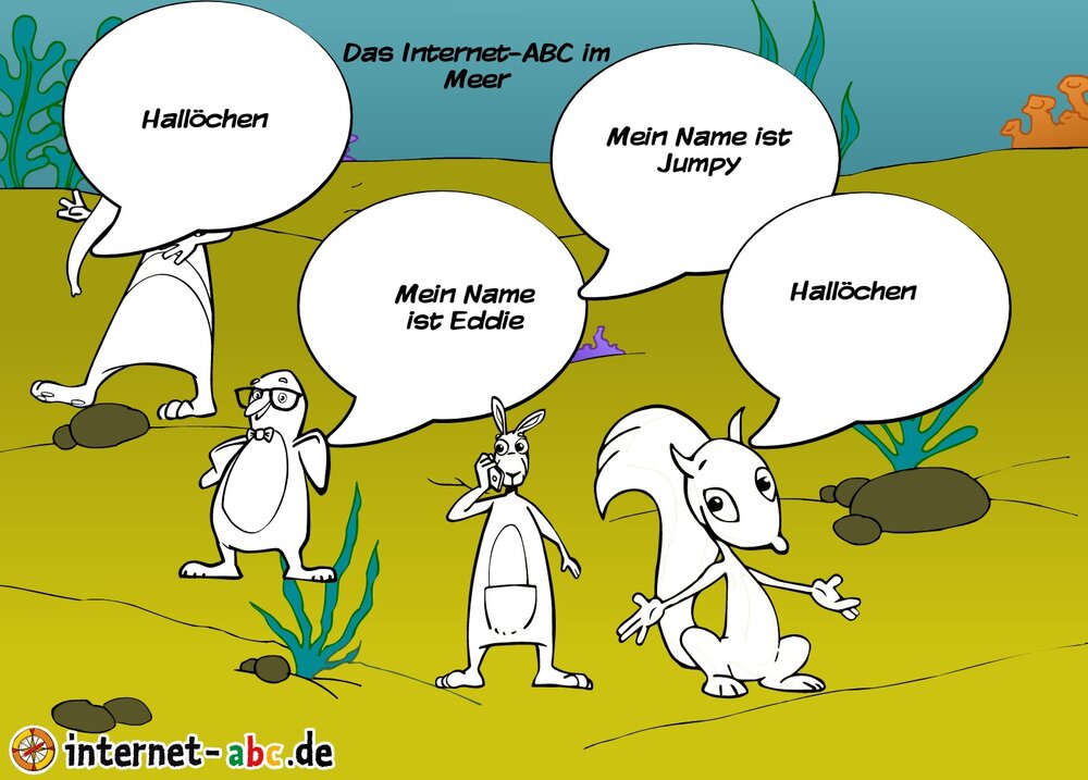 Eddie, Percy,Jumpy und Flizzy sind im Meer. Sie sagen einander, Hallöchen!