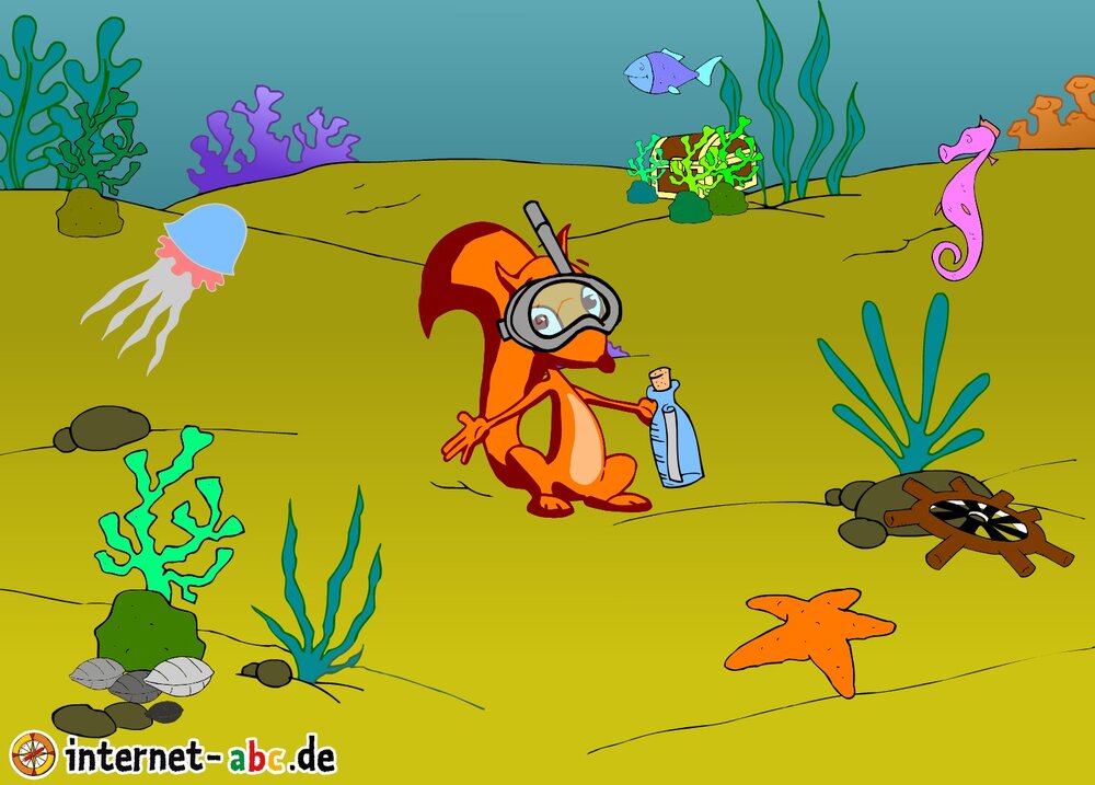 Fritzi ist unter Wasser unterwegs und findet eine Flaschenpost, die Fritzi zu einem Schatz führt. Findest du den Schatz?