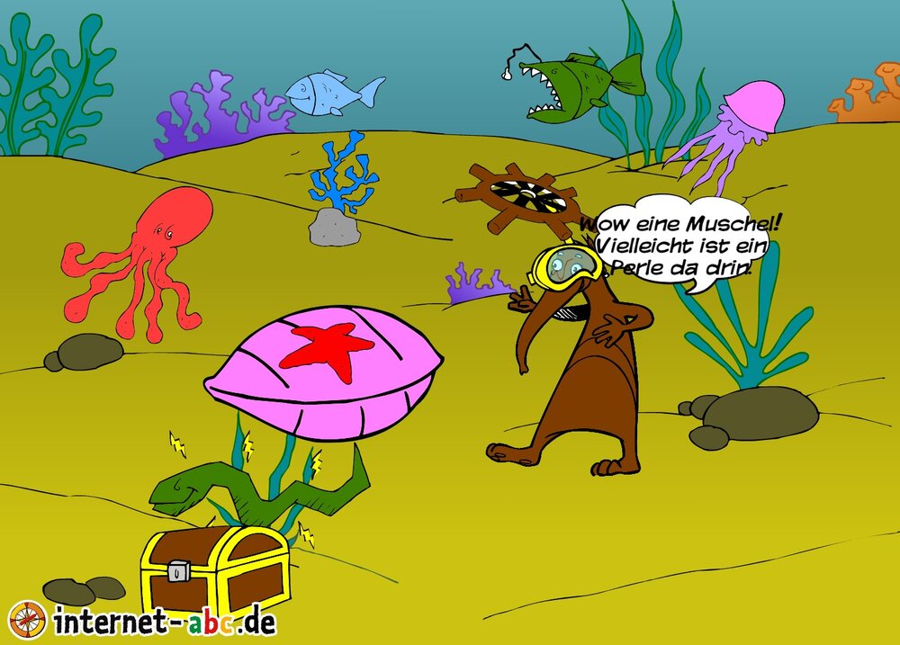 Percy macht eine Tauchreise. Er seht im Meer eine Muschel. Vielleicht ist eine Perle da drin