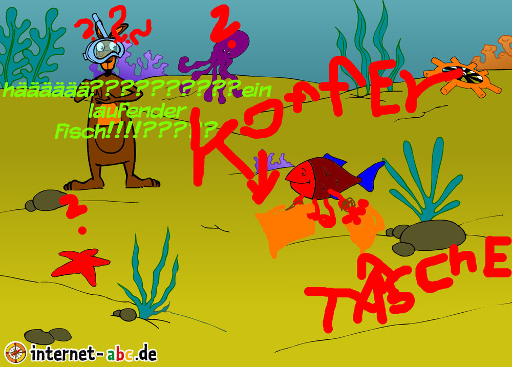 das kegngoru geht tauchen und sieht eine laufenden fisch der gerade einkaufen wahr. such alle anderen meeresbewohner