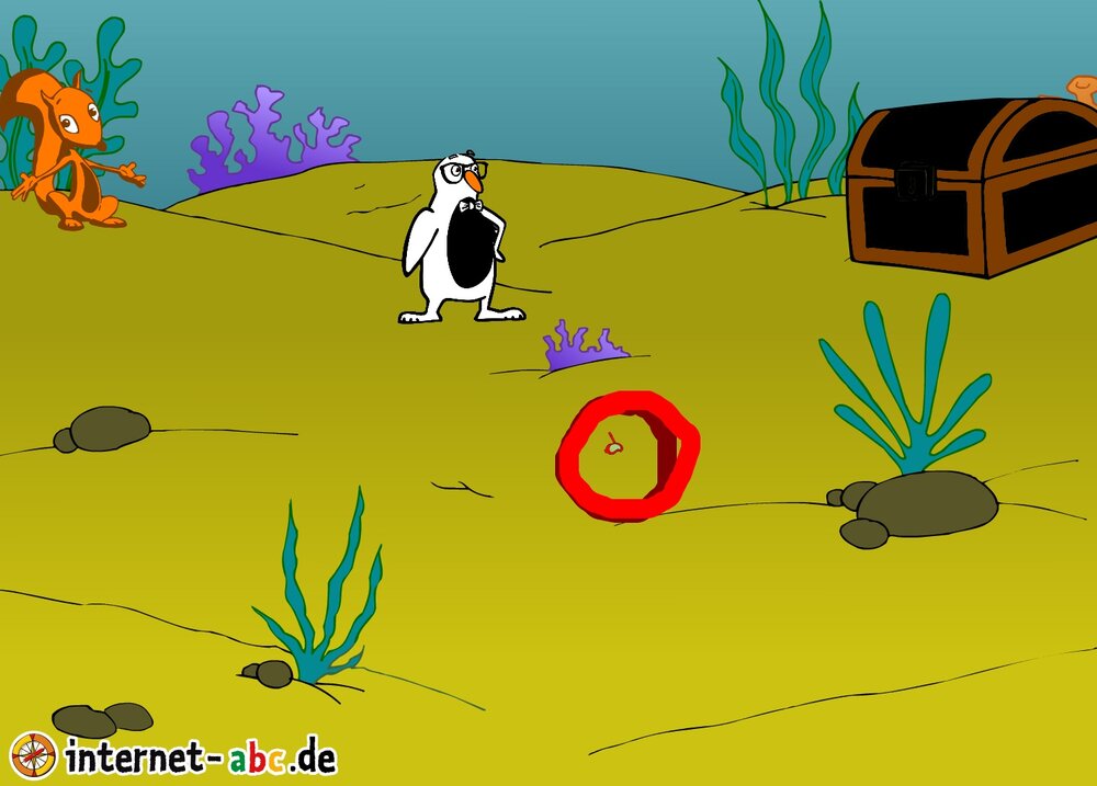 Der Pinguin findet eine Schatzkiste und sagt zu dem Eichhörnchen das er eine schatzkiste gefunden hat