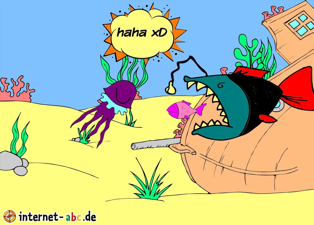 Der kleine süße pinke Fisch wird vom großem guten fisch gefressen. Die Qualle lacht und sagt dabei HAHA XD!!!!!!!!!!!!!!!!!!!!!!!!!!!!!!!!!!!!!!!