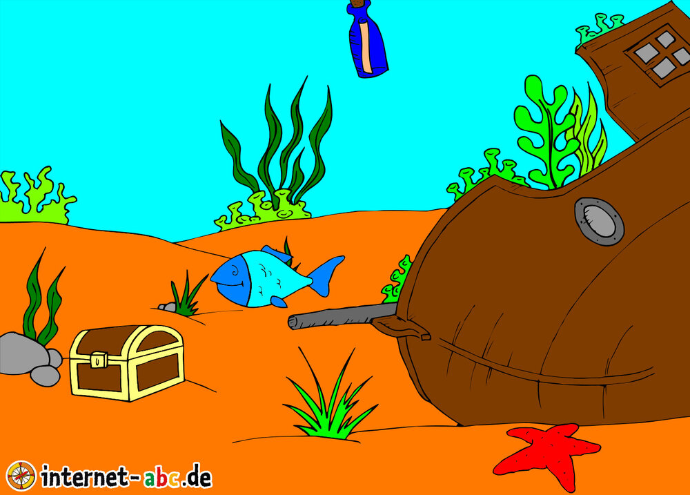 Ein Schatz ligt im Meer und ein Frack liegt herrum.