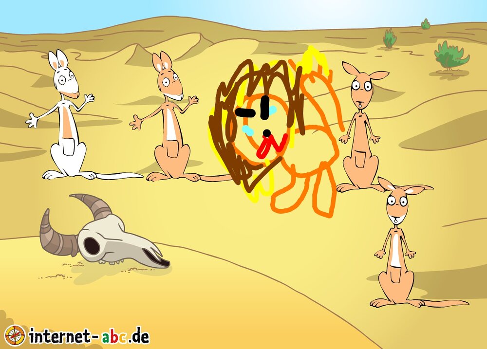 Vier Kängurus hoppelten durch Afrika.Doch auf einmal kam ein Großer Löwe.Ich will euch fressen!Brüllte er.Die Kängurus schafften es zum Glück zu entkommen.Und wenn sie nicht gestorben sind dann Leben die noch Heute.Ende🦁