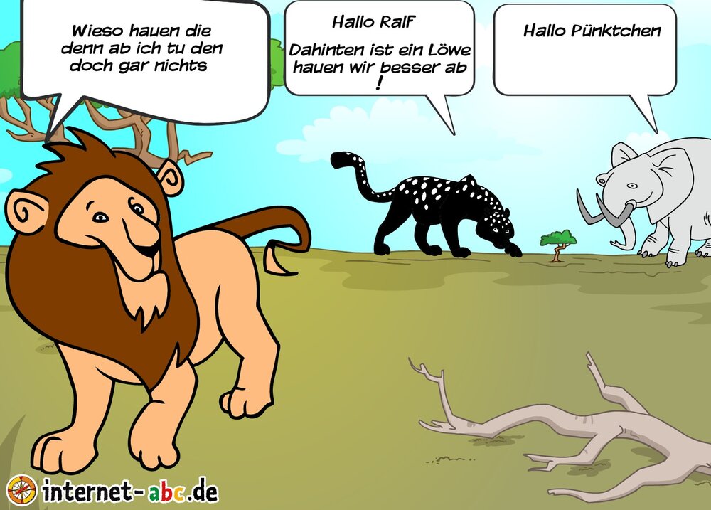 Ralf sagt zu Pünktchen hallo und der löwe wündert sich wieso die weglaufen wollen