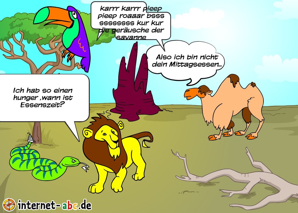 In der Savanne ist viel los. Der Löwe ist hungrig und der Papagei singt.