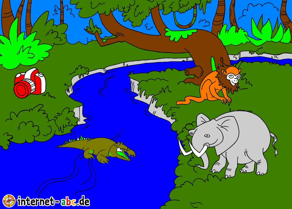 Ein Affe und ein Elefant finden eine Kamera und dann machen sie ein Foto vom Krokodil