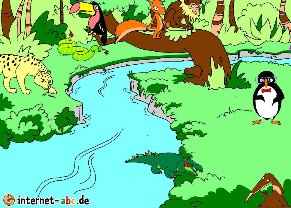 Ein hungriges Krokodil steigt aus dem Wasser .Ein Leopad schleicht sich heran.Percy ferstekt sich im Gebüsch.