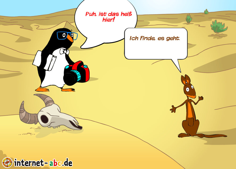 Eddi wollte in der Wüste Urlaub machen und hat sich bei einem Ausflug verlaufen.Er trifft ein Känguru und sagt zu diesem: "Puh, ist das heiß hier."Das Känguru sagt darauf:"Ich finde, es geht."