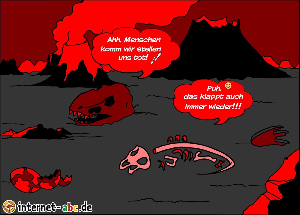 2 Dino Skelette liegen seit 1423 Jahren auf einer Vulkaninsel. Immer wieder kommen Touristen vorbei und stören die beiden.